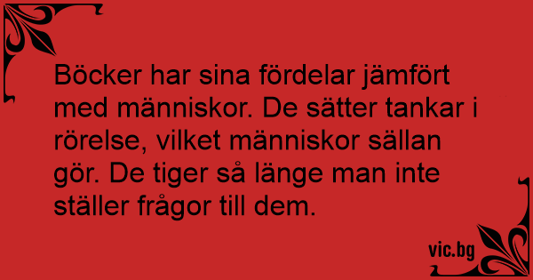 Böcker har sina fördelar jämfört med människor. De sätter tankar i rörelse, vilket människor sällan gör. De tiger så länge man inte ställer frågor till dem.