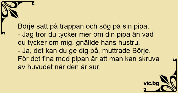 - Ja, det kan du ge dig på, muttrade Börje. För det fina med pipan är att man kan skruva av huvudet när den är sur.