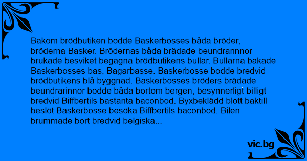 Bakom brödbutiken bodde Baskerbosses båda bröder, bröderna Basker. Brödernas båda brädade beundrarinnor brukade besviket begagna brödbutikens bullar. Bullarna bakade Baskerbosses bas, Bagarbasse. Baskerbosse bodde bredvid brödbutikens blå byggnad. Baskerbosses bröders brädade beundrarinnor bodde båda bortom bergen, besynnerligt billigt bredvid Biffbertils bastanta baconbod. Byxbeklädd blott baktill beslöt Baskerbosse besöka Biffbertils baconbod. Bilen brummade bort bredvid belgiska bananbolagets blå byggnad. Bort bortom B-lagets bisarra basarer, bort bortom brottarnas bökiga bryggor. Betongen brusade bredvid bilen. Behärskat bromsade Baskerbosse bakom bankbudets beigea buss. Bankbudet betraktade Baskerbosse blygt. Baskerbosse besvarade Bankbudets blick. Bakom balkongbrokaden beskådade båda beundrarinnorna besöket. Baskerbosse bar buttert bort bilen bakom Biffbertils baconbod. Bland bilvraken bakom baconboden brukade Biffbertil bygga billiga bider. Braket blev bedövande, "Bänd bort Bentleyn, bänd bort Bentleyn", brölade Baskerbosse besatt. Bankbudet bajsade baken brun. Båda beundrarinnorna bantade bort brösten. Bagarbasse bakade bredare bullar. Baskerbosse brottade bort bilvraken, böjde bak biderna, bankade Biffbertils brevlåda bucklig, bromsade bestört. Beskedet blottades bakom brevlådan: Biffbertil bortrest. Bankbudet blev buddhist. Båda beundrarinnorna började betala besynnerliga bankgiroblanketter beträffande betal-TV:s bredare basutbud. Baskerbosses beklagliga belägenhet bekymrade blott bredvidboende Becks bortskämda, bleka boxer.