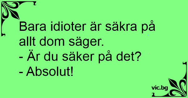 Το δίκιο των ηλιθίων - Запомни, сине! Un prof dit a ses élèves: — Запам’ятай, синку, розумна людина завжди має сумніви. Лише дурень може бути цілком упевненим у чомусь. — Ти впевнений у цьому, тато? — Абсолютно. - Запомни, сынок, умный человек всегда во всем сомневается. Только дурак может быть полностью уверенным в чем-то... - Ты уверен в этом, папа? - Абсолютно! — Запам'ятай, синку: розумна людина завжди у всьому сумнівається. Тільки повний ідіот може бути в чомусь абсолютно впевнений. — Ти в цьому впевнений, тато? — Абсолютно! La maîtresse explique à Toto : - Celui qui doute est quelqu'un d'intelligent. Il n'y a que les idiots qui sont toujours sûrs d'eux ! - Vous en êtes sûre, madame ? - Absolument certaine ! Un professeur dit a ses élèves: - Les imbéciles sont toujours sur d'eux et il n'y que les intelligents qui sont dans le doute. - En êtes vous sur professeur? Répondit un élève. - Absolument!!!... En far og søn står og vasker bil, da faren pludselig udbryder: "Du.. søn? Det er kun dumme mennesker der er helt sikre!" "Er du nu også sikker på det?" spørger sønnen. "Jada! Jeg er HELT sikker!" Öğrenci öğretmenine ” öğretmenim salakla zeki arasındaki fark nedir? ” Öğretmen hiç şüphesiz cevap verir ” salaklar kesin konuşur zekiler daima şüphelidir. ” Öğrenci: - ” gerçekten mi ? ” Öğretmen:... Tatal ii spune feciorului: - Stii, oamenii Destepti intotdeauna au dubii, pe cand cei Prostanaci sunt foarte siguri pe ei! - Serios, tata? - Absolut!