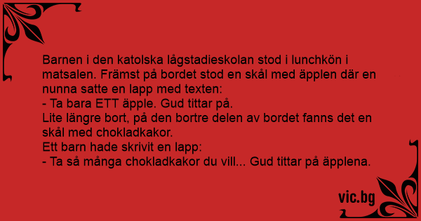 Barnen i den katolska lågstadieskolan stod i lunchkön i matsalen. Främst på bordet stod en skål med äpplen där en nunna satte en lapp med texten: