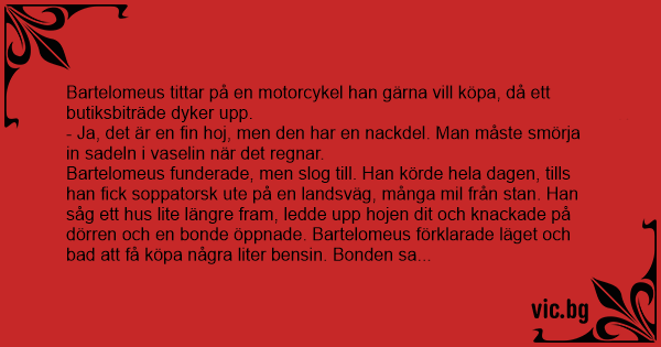 Bartelomeus funderade, men slog till. Han körde hela dagen, tills han fiск soppatorsk ute på en landsväg, många mil från stan. Han såg ett hus lite längre fram, ledde upp hojen dit och knackade på dörren och en bonde öppnade. Bartelomeus förklarade läget och bad att få köpa några liter bensin. Bonden sa att bensinen var sluт, men skulle få mer under morgondagen. Bonden blev imponerad av hojen och skrattade när han hörde om vaselinet. Han erbjöd även Bartelomeus att stanna över natten eftersom klockan var sen. Han tackade ja och blev visad till sitt ruм.