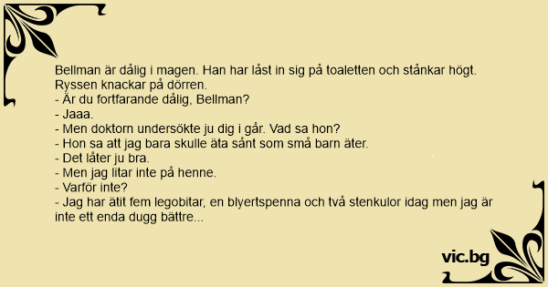 Bellman är dålig i magen. Han har låst in sig på toaletten och stånkar högt.