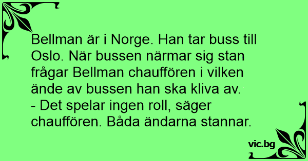 Bellman är i Norge. Han tar buss till Oslo. När bussen närmar sig stan frågar Bellman chauffören i vilken ände av bussen han ska kliva av.