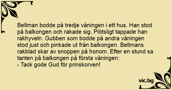 Bellman bodde på tredje våningen i ett hus. Han stod på balkongen och rakade sig. Plötsligt tappade han rakhyveln. Gubben som bodde på andra våningen stod just och pinkade ut från balkongen. Bellmans rakblad skar av snoppen på honom. Efter en stund sa tanten på balkongen på första våningen: