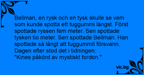Bellman, en rysk och en tysk skulle se vem som kunde spotta ett tuggummi längst. Först spottade ryssen fem meter. Sen spottade tysken tio meter. Sen spottade Bellman. Han spottade så långt att tuggummit försvann. Dagen efter stod det i tidningen: