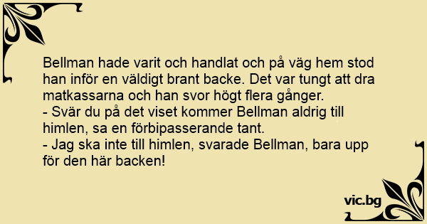 - Svär du på det viset kommer Bellman aldrig till himlen, sa en förbipasserande tant.