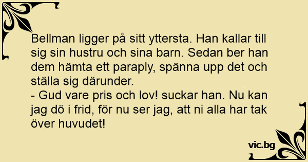 Bellman liggеr på sitt yttersta. Han kallar till sig sin hustru och sina barn. Sedan ber han dem hämta ett paraply, spänna upp det och ställa sig därunder.