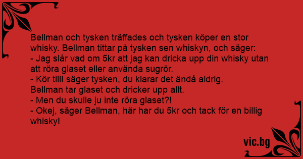 Bellman och tysken träffades och tysken köper en stor whisky. Bellman tittar på tysken sen whiskyn, och säger: