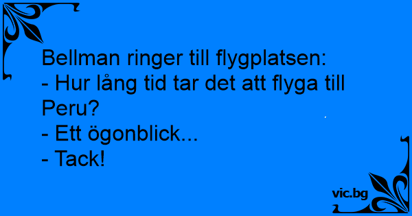 En svenske ringte til skranken i SAS og spurte: - Hvor lang tid tar det å fly herfra til London? - Et øyeblikk, svarte damen i skranken. – Mange takk, svarte svensken og la på.