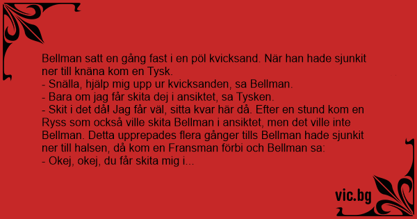 - Sкiт i det då! Jag får väl, sitta kvar här då. Efter en stund kom en Ryss som också ville skita Bellman i ansiktet, men det ville inte Bellman. Detta upprepades flera gånger tills Bellman hade sjunkit ner till halsen, då kom en Fransman förbi och Bellman sa: