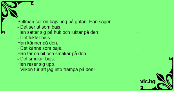 Bellman ser en bajs hög på gatan. Han säger: - Det ser ut som bajs. Han sätter sig på huk och luktar på den: - Det luktar bajs. Han känner på den. - Det känns som bajs. Han tar en bit och smakar på den. - Det smakar bajs. Han reser sig upp. - Vilken tur att jag inte trampa på den!