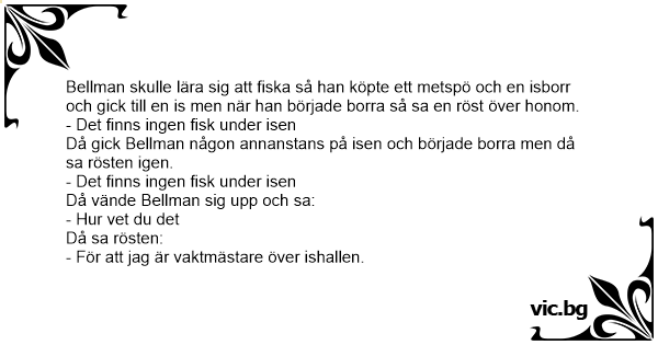 Bellman skulle lära sig att fiska så han köpte ett metspö och en isborr och gick till en is men när han började borra så sa en röst över honom.