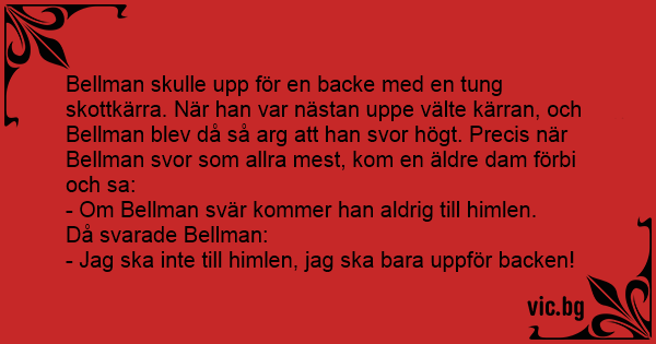 Bellman skulle upp för en backe med en tung skottkärra. När han var nästan uppe välte kärran, och Bellman blev då så arg att han svor högt. Precis när Bellman svor som allra mest, kom en äldre dam förbi och sa: