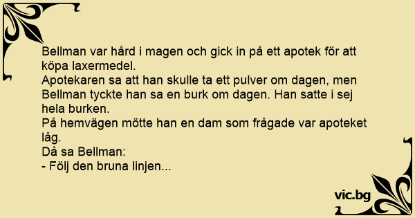 Apotekaren sa att han skulle ta ett pulver om dagen, men Bellman tyckte han sa en burk om dagen. Han satte i sej hela burken.