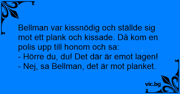 Bellman var kissnödig och ställde sig mot ett plank och kissade. Då kom en polis upp till honom och sa: