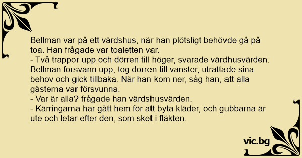 Bellman var på ett värdshus, när han plötsligt behövde gå på toa. Han frågade var toaletten var.