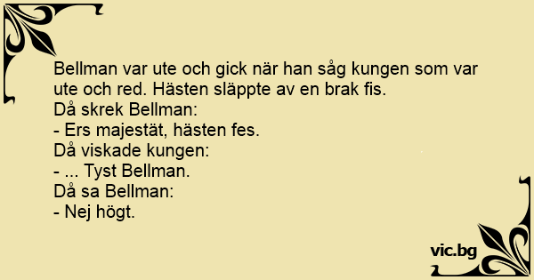 Bellman var ute och gick när han såg kungen som var ute och red. Hästen släppte av en brak fis.