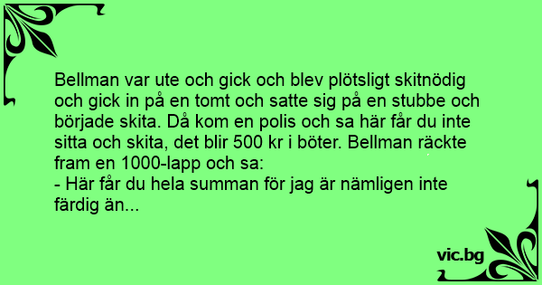Bellman var ute och gick och blev plötsligt skitnödig och gick in på en tomt och satte sig på en stubbe och började skita. Då kom en polis och sa här får du inte sitta och skita, det blir 500 kr i böter. Bellman räckte fram en 1000-lapp och sa: