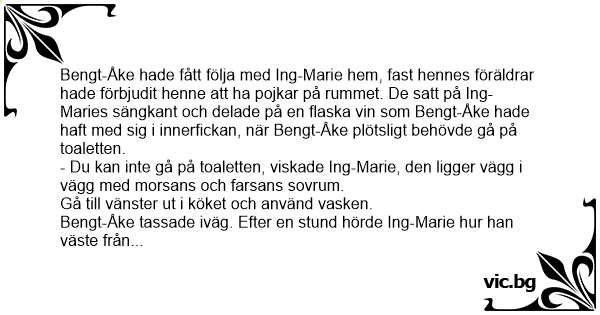 Bengt-Åke hade fått följa med Ing-Marie hem, fast hennes föräldrar hade förbjudit henne att ha pojkar på rummet. De satt på Ing-Maries sängkant och delade på en flaska vin som Bengt-Åke hade haft med sig i innerfickan, när Bengt-Åke plötsligt behövde gå på toaletten.