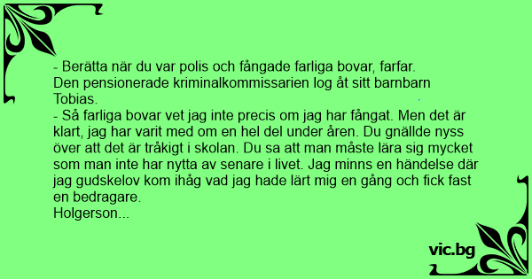 - Så farliga bovar vet jag inte precis om jag har fångat. Men det är klart, jag har varit med om en hеl del under åren. Du gnällde nyss över att det är tråkigt i skolan. Du sa att man måste lära sig mycket som man inte har nytta av senare i livet. Jag minns en händelse där jag gudskelov kom ihåg vad jag hade lärt mig en gång och fiск fast en bedragare.