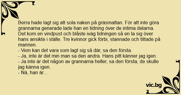 Berra hade lagt sig att sola naken på gräsmattan. För att inte göra grannarna generade lade han en tidning över de intima delarna. Det kom en vindpust och blåste iväg tidningen så en la sig över hans ansikte i ställe. Tre kvinnor gick förbi, stannade och tittade på mannen.