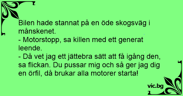 - Då vet jag ett jättebra sätt att få igång den, sa flickan. Du pussar mig och så ger jag dig en örfil, då brukar alla motorer starta!