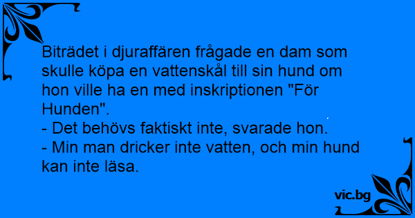 - Min man dricker inte vatten, och min hund kan inte läsa.
