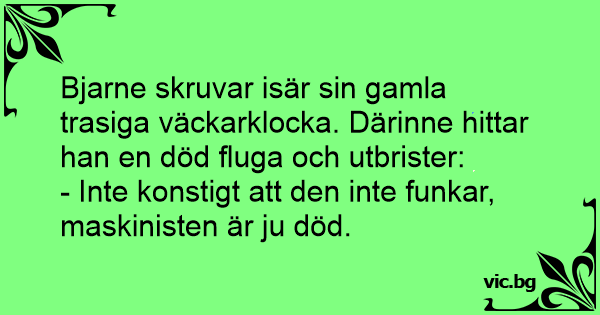 Bjarne skruvar isär sin gamla trasiga väckarklocka. Därinne hittar han en död fluga och utbrister: