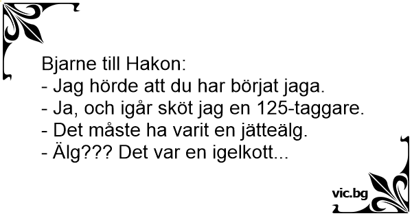 Bjarne till Hakon:<br />- Jag hörde att du har börjat jaga.<br />- Ja, och igår sköt jag en 125-taggare.<br />- Det måste ha varit en jätteälg.<br />- Älg??? Det var en igelkott...