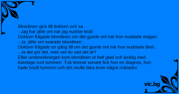 En ung brunett gick till doktorn och berättade att det gör ont på kroppen överallt där hon rör den. Omöjligt, sa doktorn. Visa mig. Hon tar fingret och trycker på armbågen och skriker högt av...
