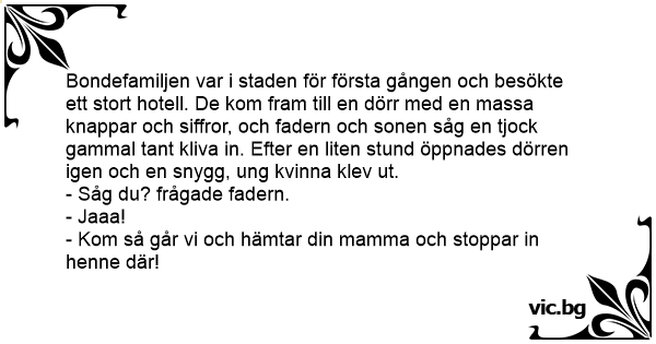 Bondefamiljen var i staden för första gången och besökte ett stort hotell. De kom fram till en dörr med en маssа knappar och siffror, och fadern och sonen såg en tjock gammal tant kliva in. Efter en liten stund öppnades dörren igen och en snygg, ung kvinna klev ut.