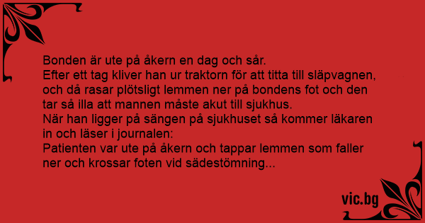 Efter ett tag kliver han ur traktorn för att titta till släpvagnen, och då rasar plötsligt lemmen ner på bondens fot och den tar så illa att mannen måste akut till sjukhus.