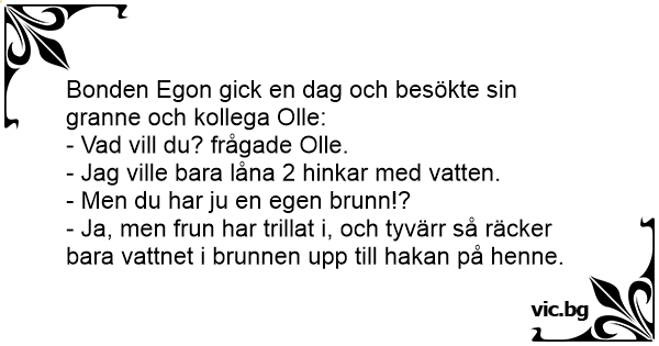 Bonden Per kom med andan i halsen till bonden Jöns: - Har du 2 spannar vatten? Jöns: - Varför då? Du har väl vatten i brunnen själv Per? Per: - Min fru ramlade i brunnen. Men vattnet räcker...