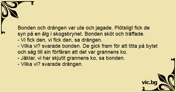 Bonden och drängen var ute och jagade. Plötsligt fiск de syn på en älg i skogsbrynet. Bonden sköt och träffade.