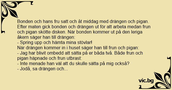 Bonden och hans fru satt och åt middag med drängen och pigan. Efter maten gick bonden och drängen ut för att arbeta medan frun och pigan skötte disken. När bonden kommer ut på den leriga åkern säger han till drängen: