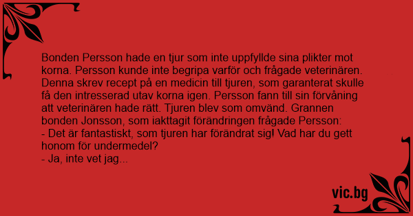 Bonden Persson hade en tjur som inte uppfyllde sina plikter mot korna. Persson kunde inte begripa varför och frågade veterinären. Denna skrev recept på en medicin till tjuren, som garanterat skulle få den intresserad utav korna igen. Persson fann till sin förvåning att veterinären hade rätt. Tjuren blev som omvänd. Grannen bonden Jonsson, som iakttagit förändringen frågade Persson: