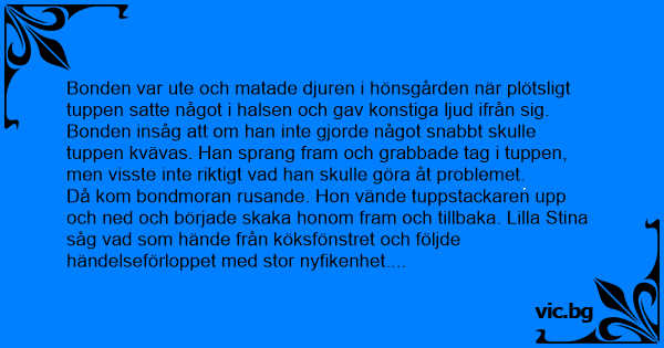 Bonden var ute och matade djuren i hönsgården när plötsligt tuppen satte något i halsen och gav konstiga ljud ifrån sig. Bonden insåg att om han inte gjorde något snabbt skulle tuppen kvävas. Han sprang fram och grabbade tag i tuppen, men visste inte riktigt vad han skulle göra åt problemet.