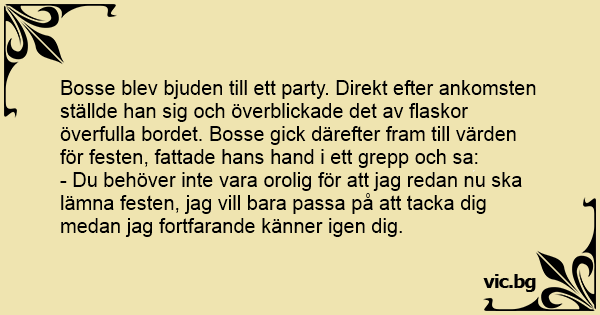 Bosse blev bjuden till ett party. Direkt efter ankomsten ställde han sig och överblickade det av flaskor överfulla bordet. Bosse gick därefter fram till värden för festen, fattade hans hand i ett grepp och sa: