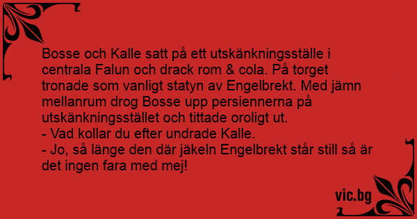 Bosse och Kalle satt på ett utskänkningsställe i centrala Falun och drack rom & cola. På torget tronade som vanligt statyn av Engelbrekt. Med jämn mellanrum drog Bosse upp persiennerna på utskänkningsstället och tittade oroligt ut.