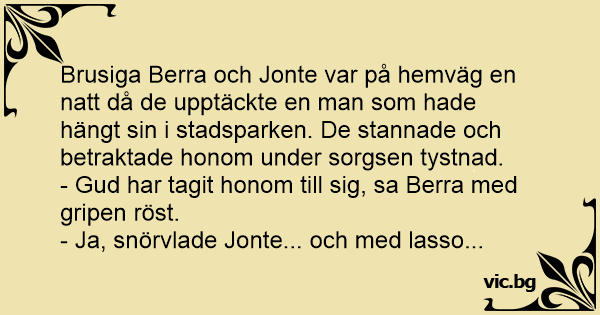Brusiga Berra och Jonte var på hemväg en natt då de upptäckte en man som hade hängt sin i stadsparken. De stannade och betraktade honom under sorgsen tystnad.