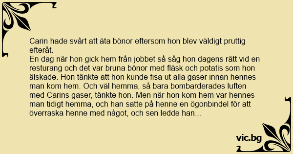 En dag när hon gick hem från jobbet så såg hon dagens rätt vid en resturang och det var bruna bönor med fläsk och potatis som hon älskade. Hon tänkte att hon kunde fisa ut alla gaser innan hennes man kom hem. Och väl hemma, så bara bombarderades luften med Carins gaser, tänkte hon. Men när hon kom hem var hennes man tidigt hemma, och han satte på henne en ögonbindel för att överraska henne med något, och sen ledde han henne till matbordet.