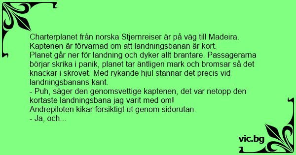 Det var ett par norrmän som flög ett litet privatplan När de gick in för landning på en flygplats i norge utspelade sig det här. När planets hjul nuddade marken så tvärbromsade han! Då sa den...