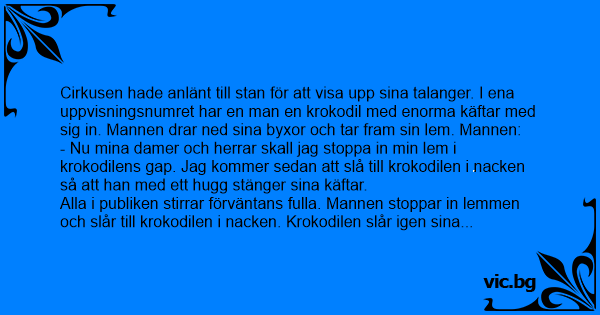 Cirkusen hade anlänt till stan för att visa upp sina talanger. I ena uppvisningsnumret har en man en krokodil med enorma käftar med sig in. Mannen drar ned sina byxor och tar fram sin lem. Mannen: