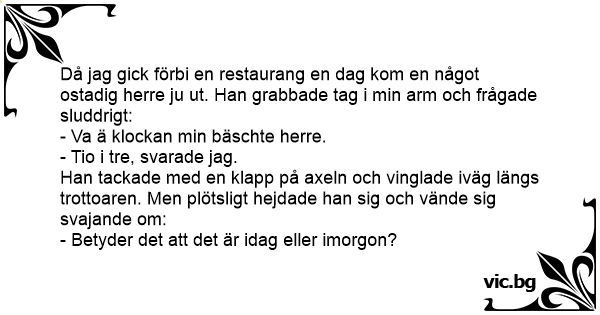 Då jag gick förbi en restaurang en dag kom en något ostadig herre ju ut. Han grabbade tag i min arm och frågade sluddrigt: