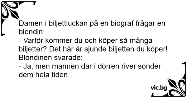 Jednog dana dođe plavuša u kino. Dođe kod blagajnika i kupi kartu, nakon 2 minute vrati se prodavaču i opet kupi kartu. Kad ono se ona opet vratila te je kupila još nekoliko karata. Nakon petog...