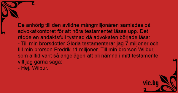 - Till min brorsdotter Gloria testamenterar jag 7 miljoner och till min brorson Fredrik 11 miljoner. Till min brorson Wilbur, som alltid varit så angelägen att bli nämnd i mitt testamente vill jag gärna säga:
