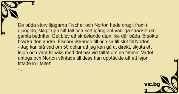 De båda storviltjägarna Fischer och Norton hade dragit fram i djungeln, slagit upp sitt tält och kört igång det vanliga snacket om gamla bedrifter. Det blev ett skrävlande utan like där båda försökte bräcka den andre. Fischer ilskande till och sa till sluт till Norton: