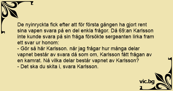 - Gör så här Karlsson. när jag frågar hur många delar vapnet består av svara då som om, Karlsson fått frågan av en kamrat. Nå vilka delar består vapnet av Karlsson?
