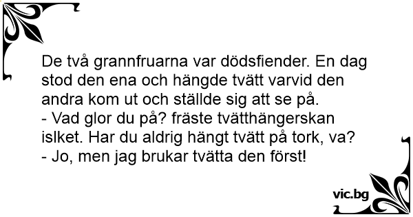 De två grannfruarna var dödsfiender. En dag stod den ena och hängde tvätt varvid den andra kom ut och ställde sig att se på.